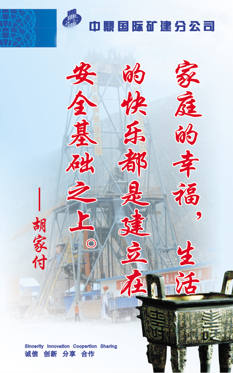 4、为配合开展学习“白国周班组管理法”,项目部把“白国周班组管理法”的主要内容用漫画的形式制作成精美的牌板放在井口,直 观、明了、新颖,宣染气氛。这几项安全文化形式得到了甲方、监理、兄弟单位、全体员工的高度评价。都认为内容丰富、形式新颖、可视性强,既体现了项目部安全文化特色,又给项目部增添了一道靓丽的风景线,而且为形成浓厚的安全文化氛围进而为搞好安全生产发挥不可替代的作用。