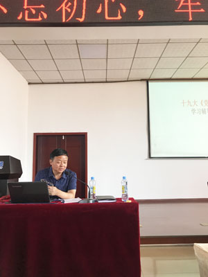 贺学良在《十九大党章学习辅导》课上,重点阐述了三个问题:1、要充分认识党章修改的必要性和学习新党章的重要性;2、要切实把握新党章的内容和要求;3、推动新党章的贯彻和落实,关键在学懂、弄得、做实。学习期间贺学良带领全体党员集体重温了入党誓词,表达了对党的无限忠诚和为党的事业奋斗终身的决心。