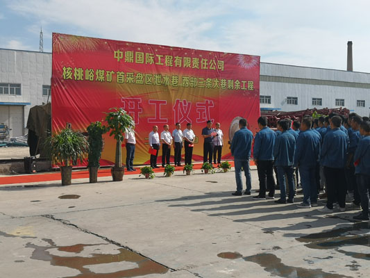 贺学良在开工仪式上讲话。他说,核桃峪煤矿工程项目是庆阳市重点建设项目,是华能集团千万吨级大型煤炭项目,目标是打造成华能集团样板煤矿,建设为国内一流现代化煤矿。中鼎国际工程有限责任公司作为核桃峪矿井首采盘区泄水巷、西部三条大巷剩余工程的承建单位,使命光荣,责任重大。中鼎国际定当全力以赴、不负重托把在华能集团的第一个项目一炮打响。