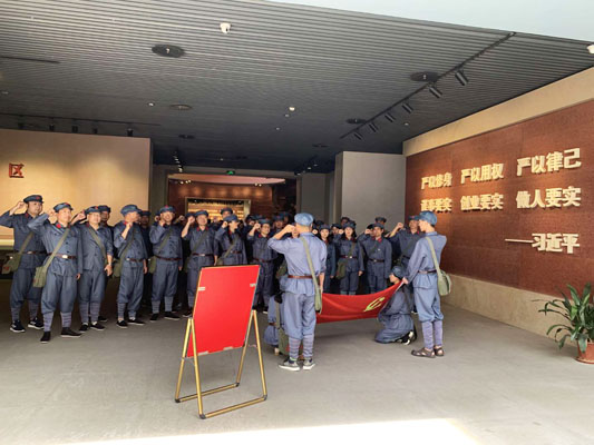 7月26日下午,开班仪式在苏区模范县兴国举行。先是由专业教官对支部党员进行简单的“军姿军容”培训,接着授班旗,然后举行开班仪式。在开班仪式上,支部书记李上高作了开班动员讲话,党委书记贺学良结合工作实际作了伟大的苏区精神专题报告。贺学良强调指出,学习弘扬苏区精神,一是要深刻理解、准确把握其精神实质,二是要与当前开展的“不忘初心 牢记使命”主题教育紧密结合,三是要与当前开展的各项重点工作以及自身业务工作紧密结合。“不忘初心,方得始终,初心易得,始终难守”,我们学习苏区精神,就是要汲取蕴含其中的历史经验和胜利之道,把这种精神当作砥砺奋进、开拓进取的标杆,把精力集中在干事创业、推动发展上,将这些精神财富内化于心,外化于行,实化于果,最终落实在公司的发展上。