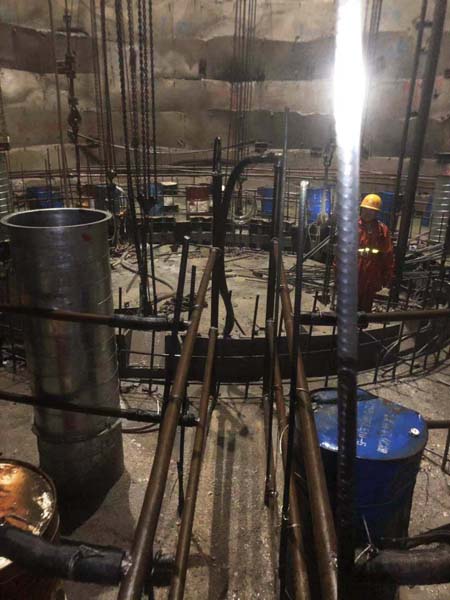 曲江中央风井维修是全国罕见的井筒垮塌修复治理工程,目前揭露的垮高67.5m,垮塌段最大直径达21m,反浇永久井壁最大的难题是如何解决大体积砼降温散热,在矿建分公司、南方指挥部各级领导的指导及曲江项目部全体职工的精诚团结下,制定了合理有效的施工方案,利用预埋冷却循环水管及散热竹节筒并严格落实温控监测,解决了大体积砼水化热的问题,也是全国首次立井井壁大体积砼在空间受限制的范围内浇筑使用的温控措施,截止到10月16日浇筑剩余高度8.5m,成功确保了大体积砼的浇筑质量,得到了业主的高度认可。