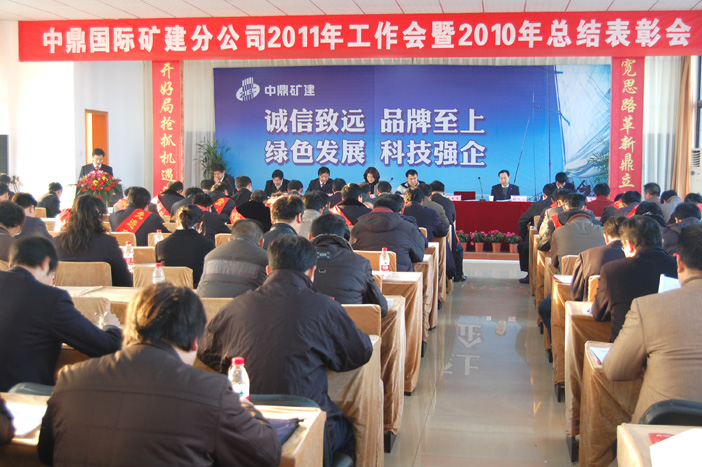 1月10日上午8时,公司2011年工作会暨2010年总结表彰会在雄壮的国歌声和激越的礼炮声中隆重召开。中鼎总部胡立俭总经理、党委副书记李长青在百忙中莅临大会指导并发表了重要讲话。司属各单位领导、社区办事处负责人、劳动模范、先进个人、先进项目代表以及机关全体员工一百多人参加了会议。中鼎总部六楼会议室气氛热烈,暖意融融。“诚信致远、品牌至上、绿色发展、科技强企”十六个大字在蔚蓝色的背景板上与远行的航船遥相呼应,催人遐思;“开好局抢抓机遇谋发展、宽思路革新鼎立铸辉煌”的条幅内容书写矿建人的豪迈气概和坚实步伐。