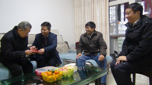 傅行吉一行先后探望退休干部管恒耀、贺崴和离休干部蒋瑞珍,每到一处傅总都嘘寒问暖,与大家亲切交谈,共话发展成绩,共叙企业未来,详细了解他们的生活、身体及家庭情况,并代表中鼎集团、矿建分公司为他们送上慰问金,祝他们新春愉快、健康长寿、家庭幸福、万事如意。看到几位老干部身体健康、生活无忧,傅总十分欣慰,希望老干部们在保重身体的同时,有空多走动联系,一如既往地多提宝贵意见和建议,支持帮助企业把各项工作做得更好。